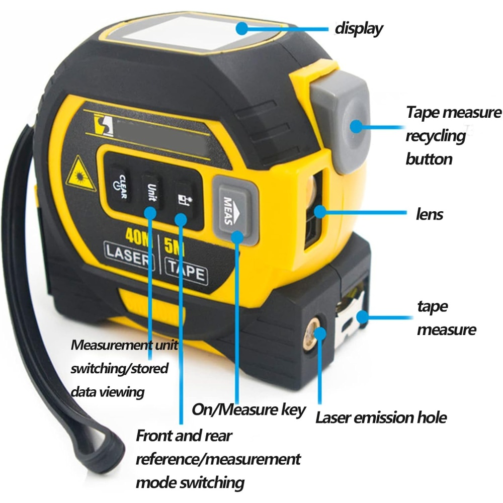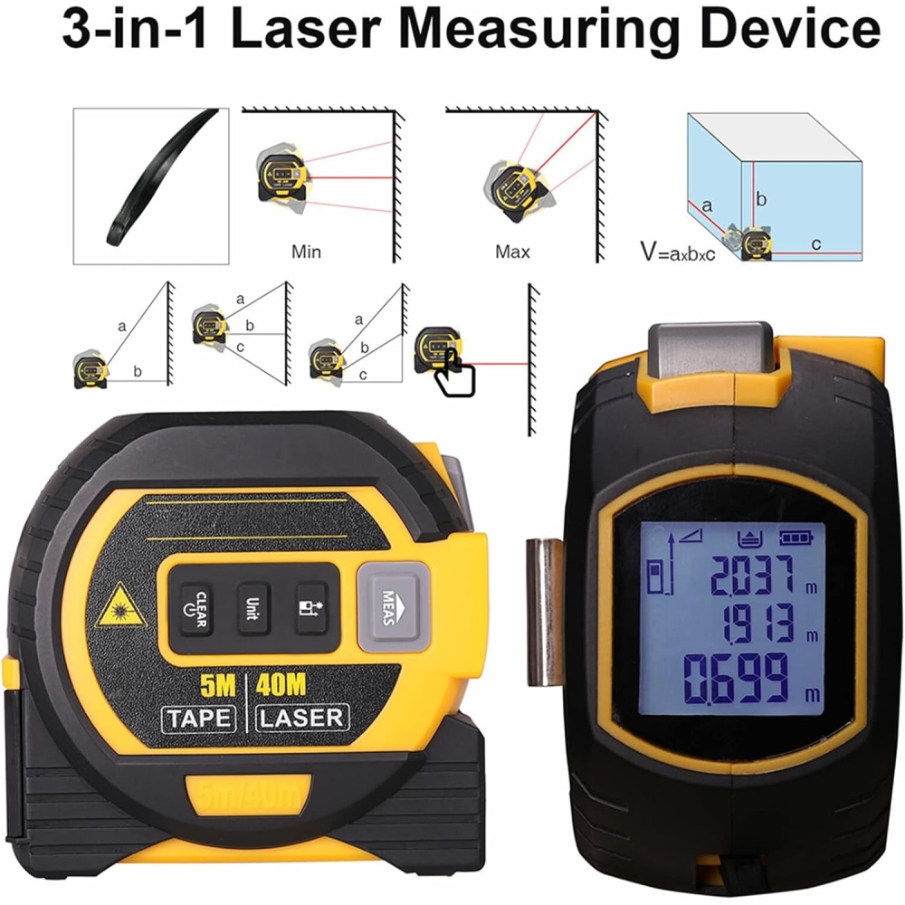 Upgrade your measuring accuracy with this advanced 3-in-1 digital laser tape measure, combining a 40m (131ft) infrared laser, a 5m/16ft steel tape measure, and laser cross marking in one compact, durable device. Perfect for professionals and homeowners working in construction, home improvement, interior design, and large space measurement.