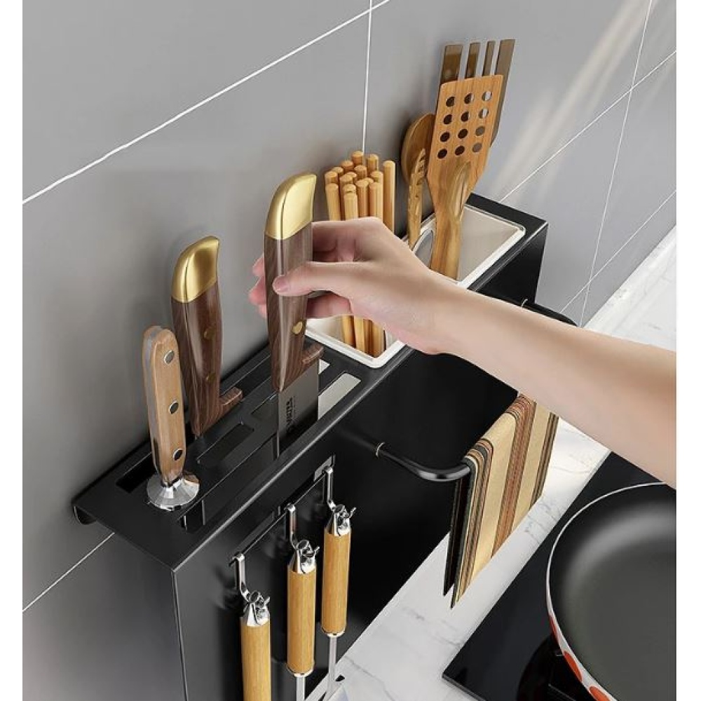 Holds knives, cutting boards, and other kitchen tools in one compact rack.