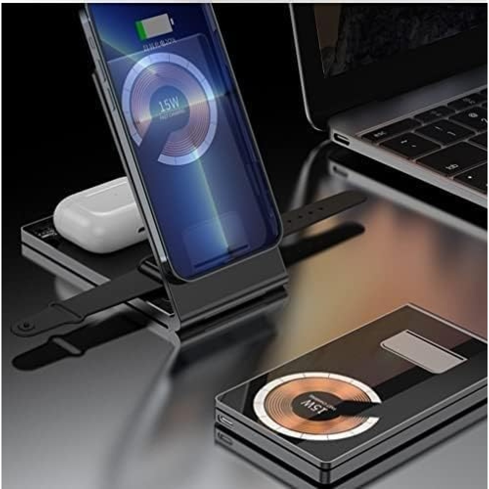 All-in-one wireless charger designed for iPhone, Apple Watch, AirPods, and an additional USB device.