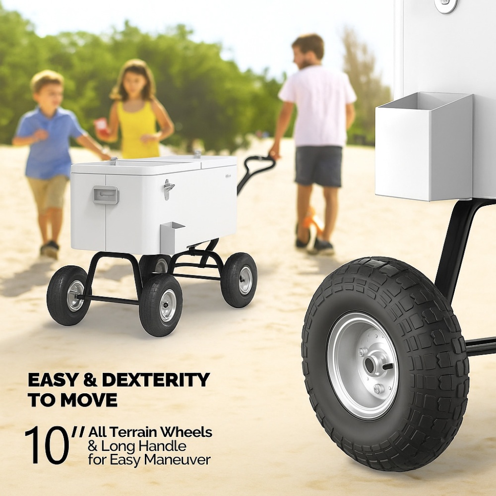 Equipped with four large 10" inflatable all-terrain wheels and a long handle for smooth movement on grass, sand, or pavement.
