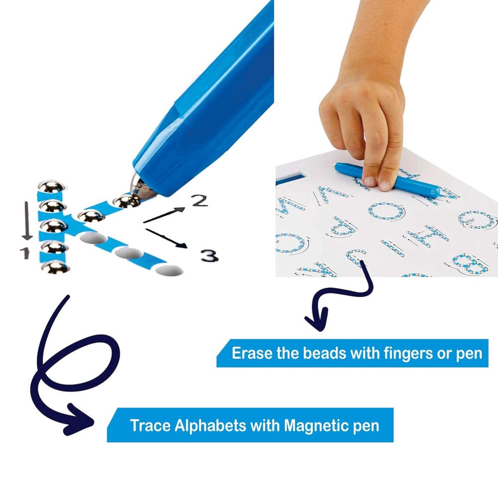 Comes with an easy-to-use magnetic stylus that allows children to “draw” letters by pulling magnetic beads to the surface — fun, mess-free, and reusable.