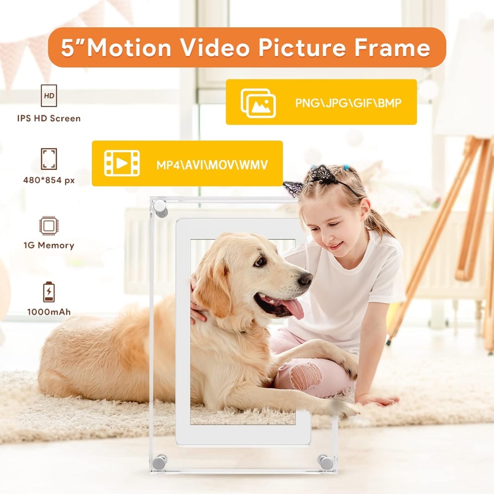 Equipped with a 5-inch HD LCD screen and 4GB internal memory, this frame plays your favorite videos or photos in 480x854 pixel resolution with smooth motion display.