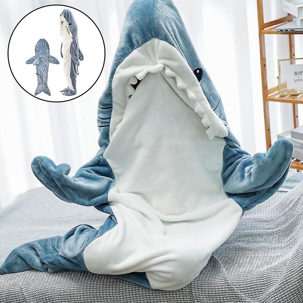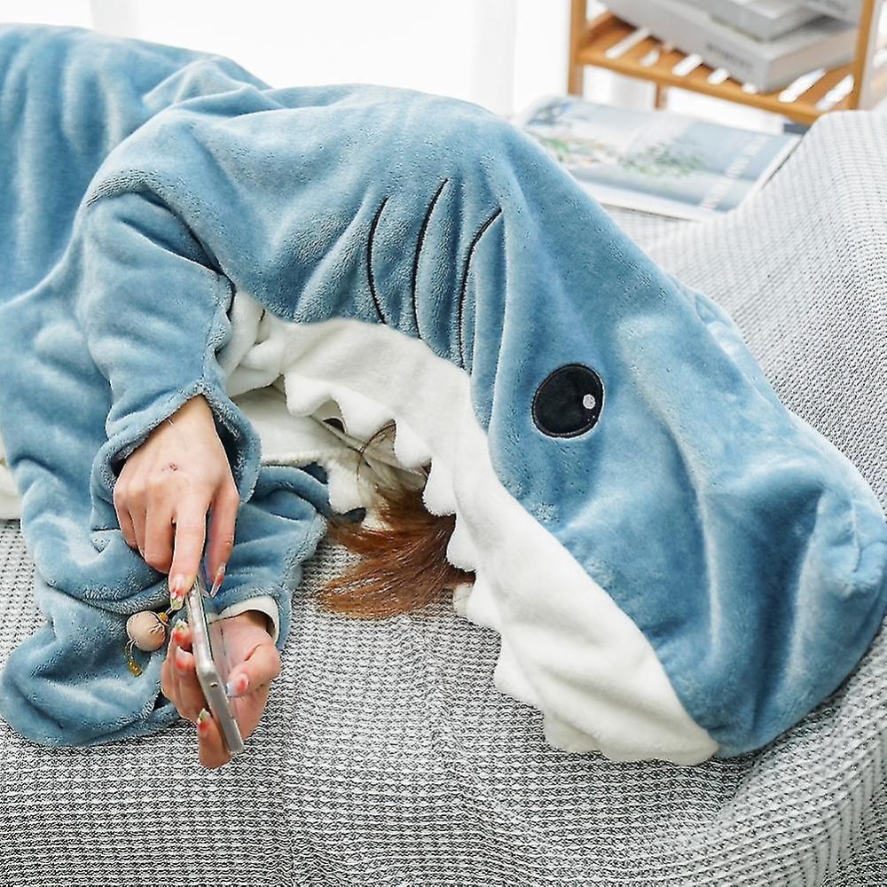 Cozy blanket costume shaped like a friendly shark.