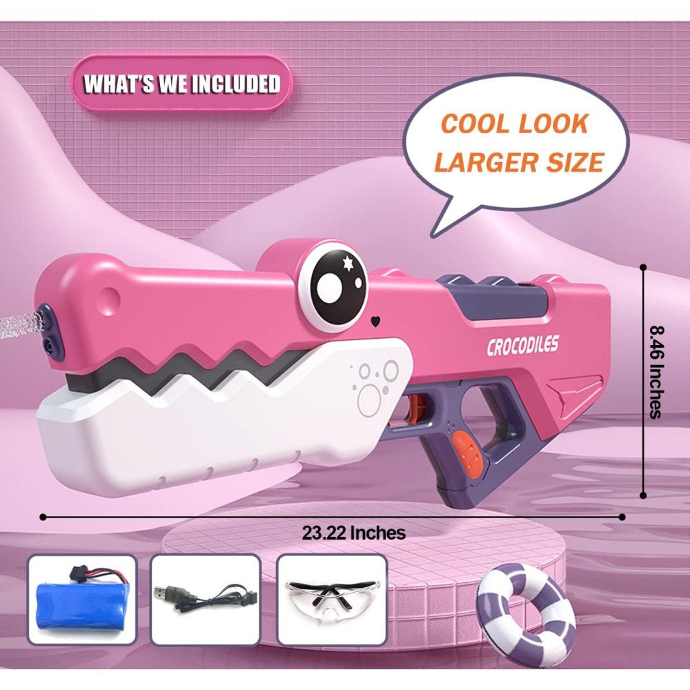 Crocodile Electric Water Gun 10-15M Range - 3.7V 500MAH Lithium Battery, Pink