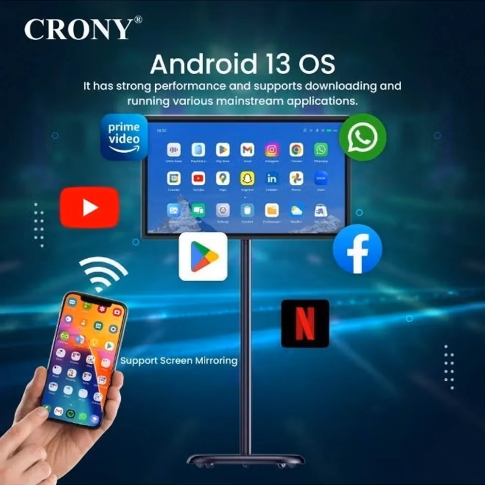 Upgrade the way you work, teach, and entertain with the Crony 21.5-inch Smart Touch Monitor. Designed with a sleek metal body and powered by Android 12, this all-in-one smart display offers a giant tablet experience with professional performance — perfect for offices, schools, showrooms, and home use.
