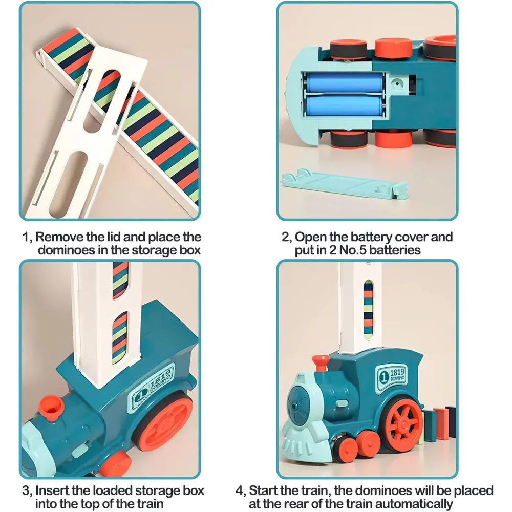 Simply load the dominoes into the train. Switch it on to enjoy automatic movement with lights and realistic steam train sounds.