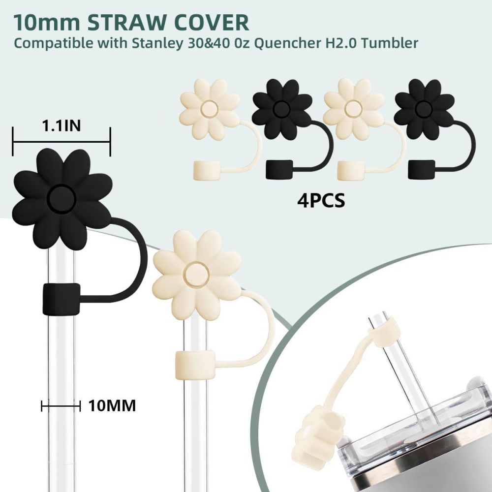 Flower Straw Covers Toppers for Stanley Cups 30&40 Oz Tumbler Accessories 4PCS Silicone Straw Caps Reusable Straw Tips Protectors for Stanley Cup 10mm 0.4in Straws (Black/Off-White/Pink/purple/beige)