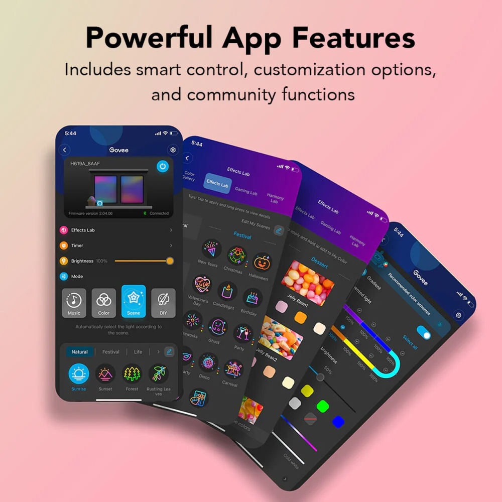 Control your lights easily through the Govee Home App via Wi-Fi or Bluetooth. You can also sync them with music and control them remotely.