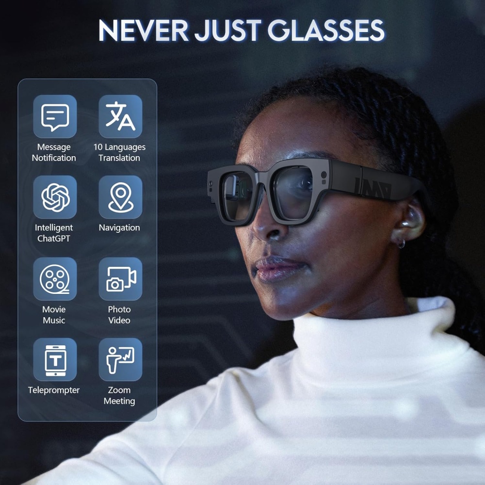ChatGPT assistant, real-time translation in 10 languages, teleprompter, video/photo capture, movie viewing, and phone calls—all in one device.