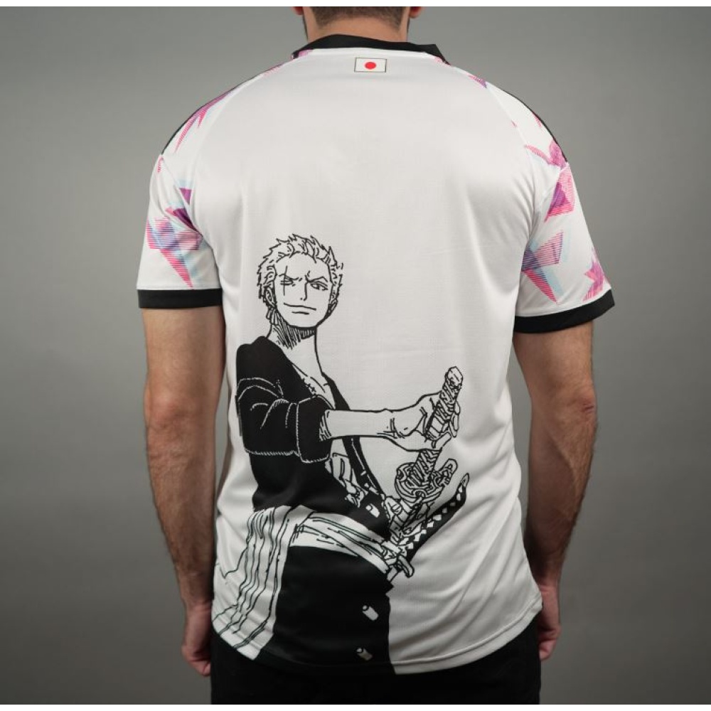 The all-white jersey features design accents inspired by Zoro’s character, making it a must-have piece for anime and football enthusiasts alike.