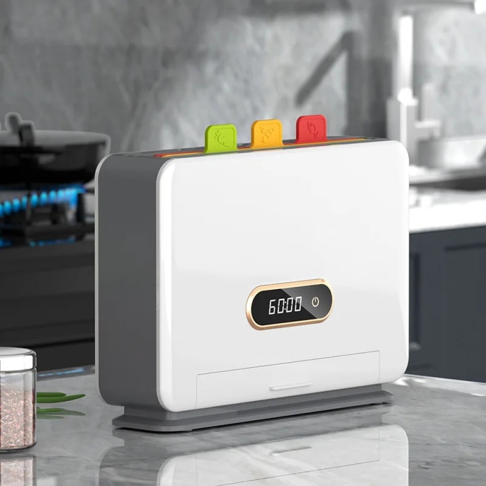 Transform your kitchen countertop with this smart and space-saving solution. This multifunctional knife holder comes with built-in sterilization and three color-coded cutting boards to keep your kitchen tools organized, clean, and ready to use.