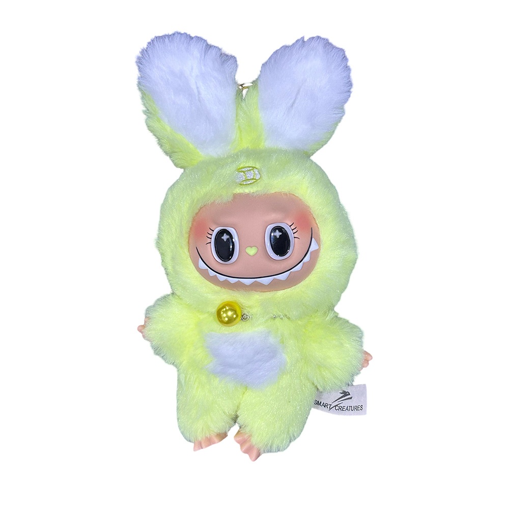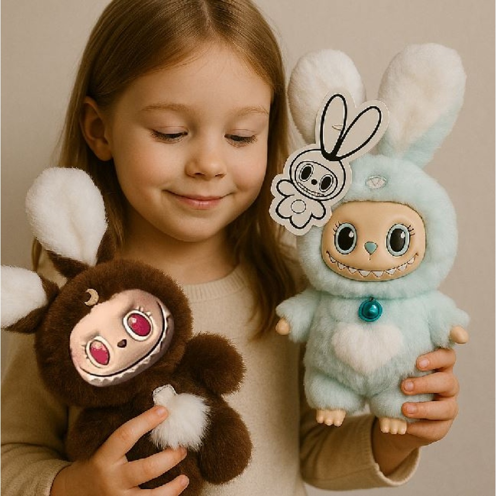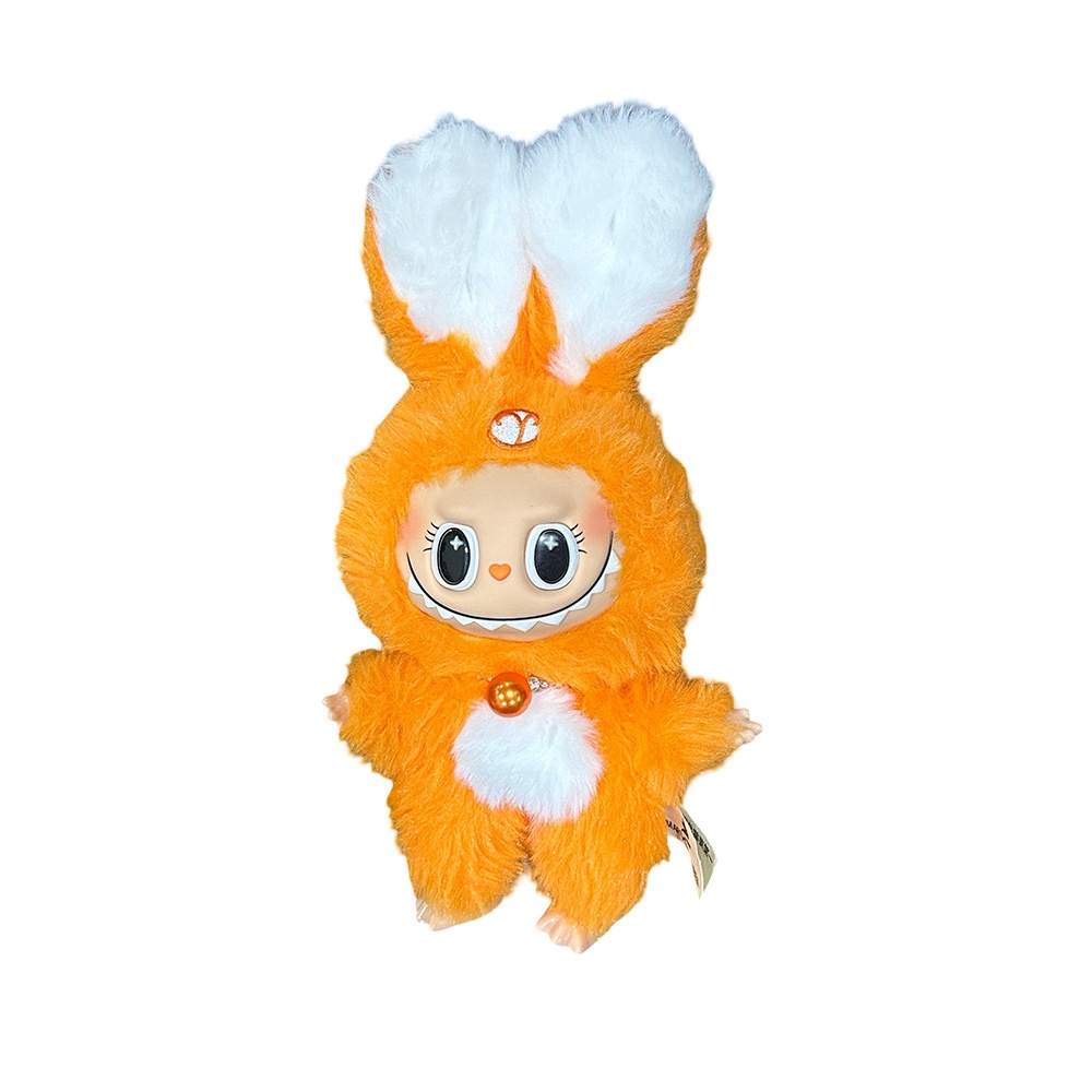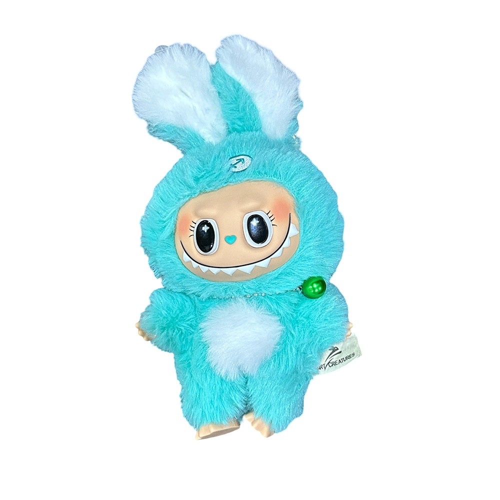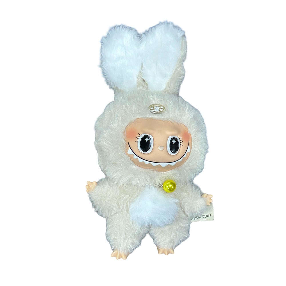 Labubu appears in a cute rabbit outfit with detailed stitching and signature character charm.