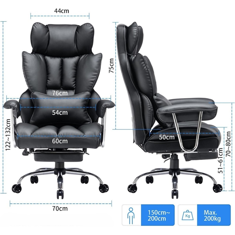 Features: Adjustable headrest, lumbar cushion, extendable footrest, 3 comfort positions