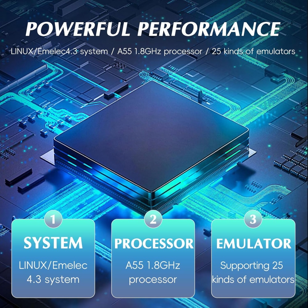 Equipped with a LINUX/Emelec4.3 system, a potent A55 1.8GHz processor, and support for 25 different emulators, this console delivers smooth, responsive gameplay, even for the most demanding retro games. Experience performance that keeps up with your gaming needs.