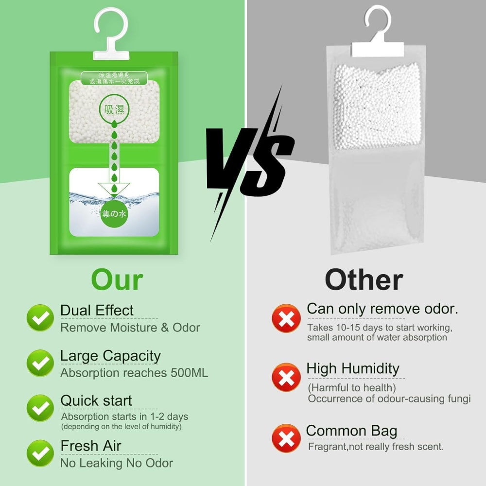 Equipped with high-efficiency desiccant particles, these bags are designed to remove excess humidity, prevent mold and odors, and maintain a comfortable, moisture-free environment — perfect for use at home, in storage areas, or on the go.