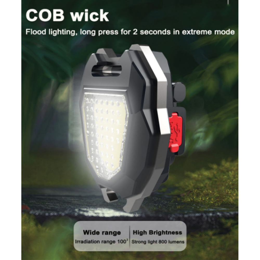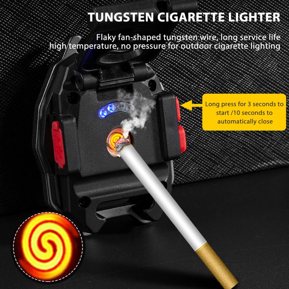 Combines LED keychain light, COB flashlight, and cigarette lighter in one compact device.