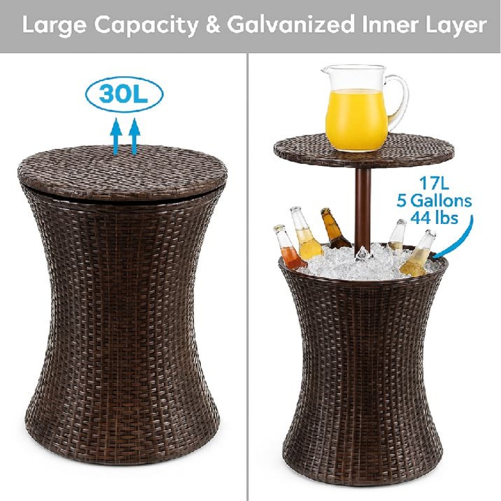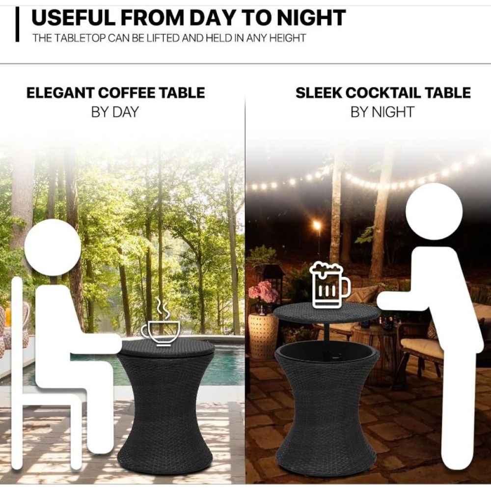 Combines a cooler, cocktail table, and coffee table with adjustable height to meet various needs. Perfect accessory for BBQs and summer parties.