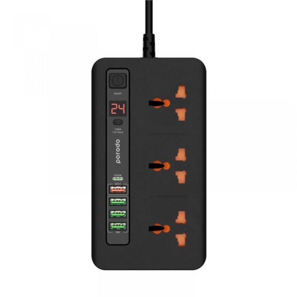 Porodo 3 AC 4 USB-A & USB-C PD 20W Hub 2M UK Black