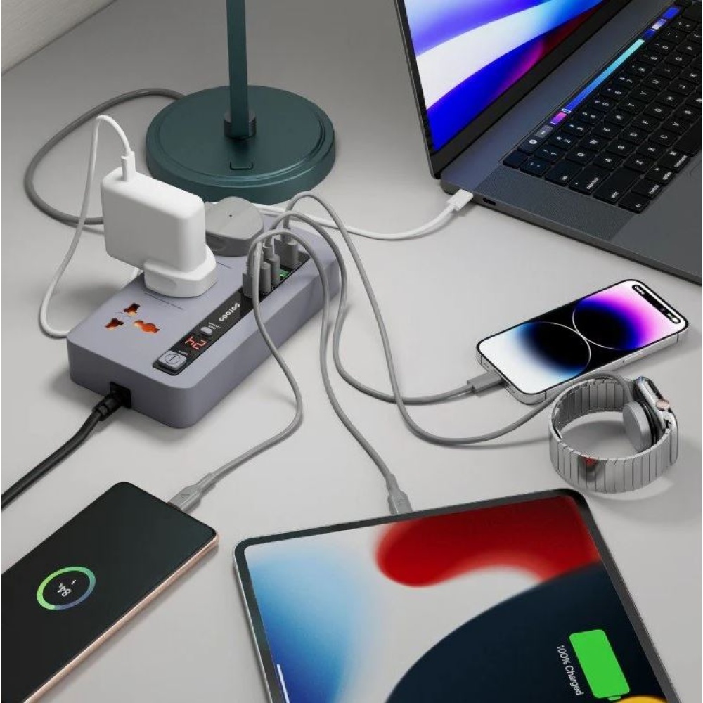 The Porodo 3 AC 4 USB-A & USB-C PD 20W Hub offers a perfect solution for all your charging and data transfer needs. With 3 AC outlets and 4 USB ports (2 USB-A and 2 USB-C PD), this hub can power and charge multiple devices simultaneously.