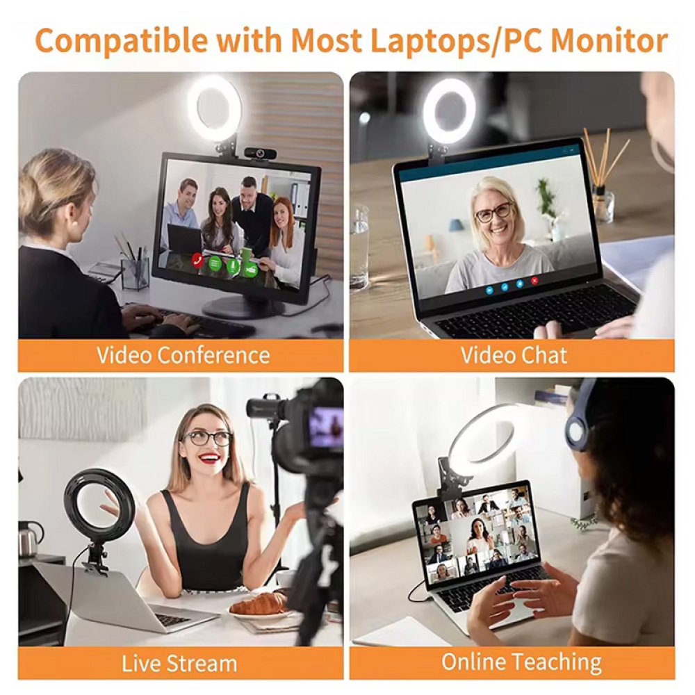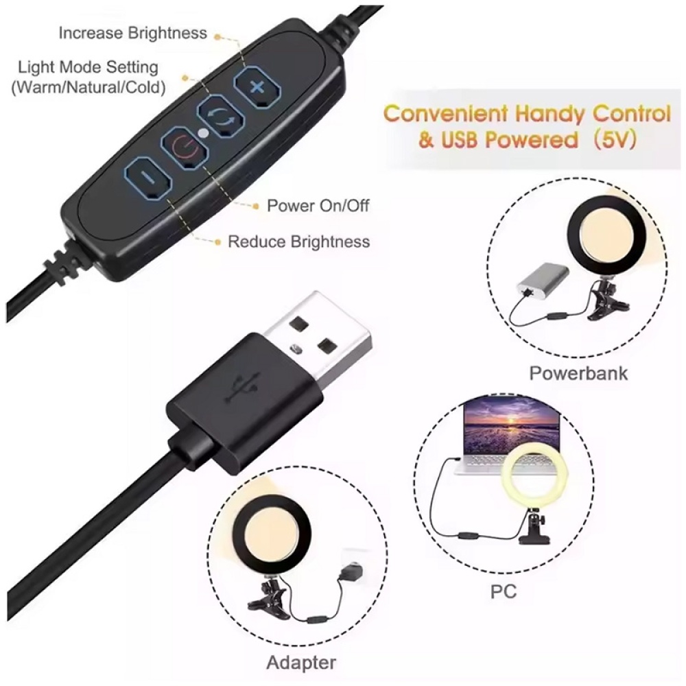 Selfie light ring works with most devices that support USB ports, like laptops, PC, power banks, USB chargers, AC adapters, and etc.