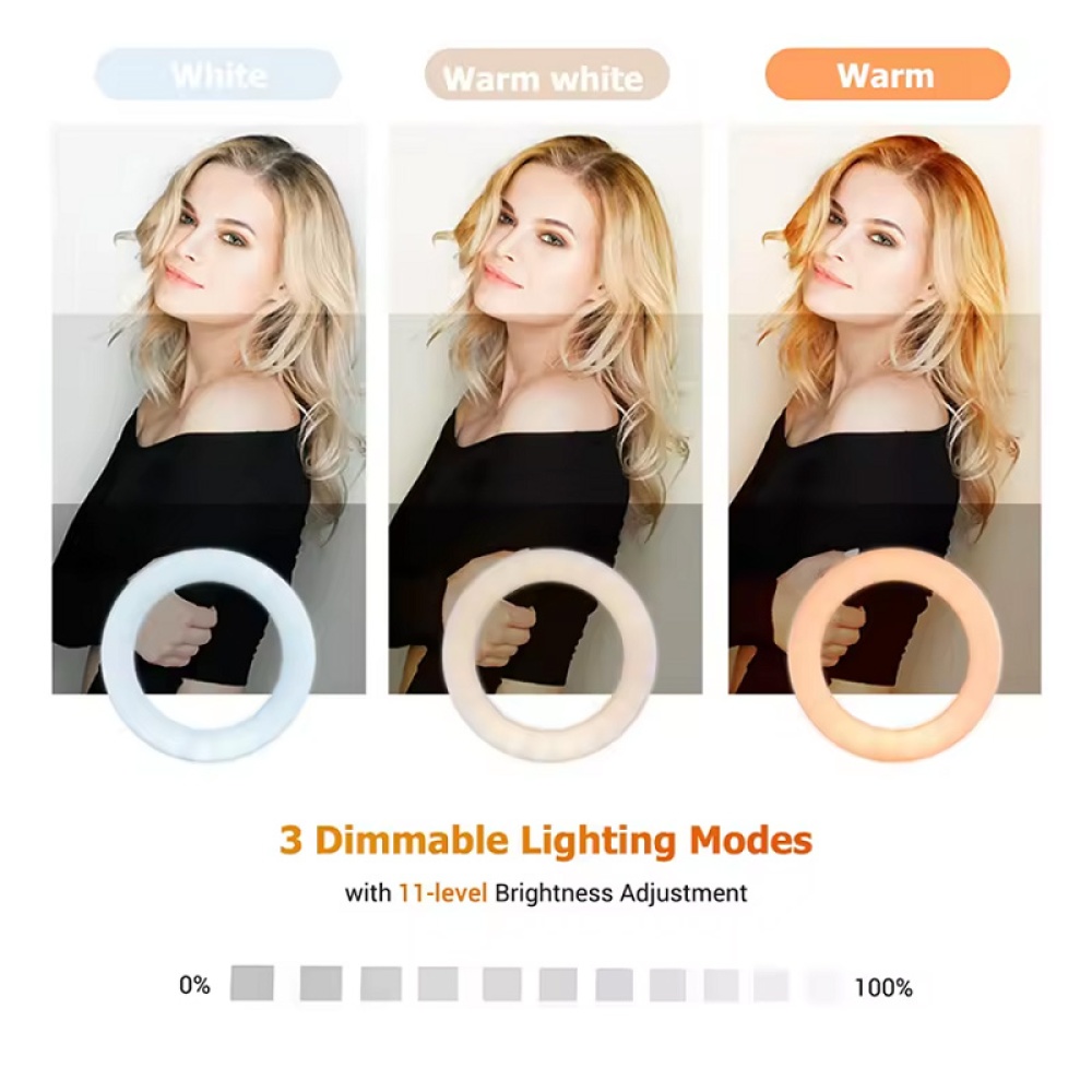 Each lighting mode has 10 different brightness, LED ring light has 3 light colors – warm, warm white, white. Color temperature is adjustable from 2700k to 5500K. The bright colors can create a unique atmosphere and meet your various needs.