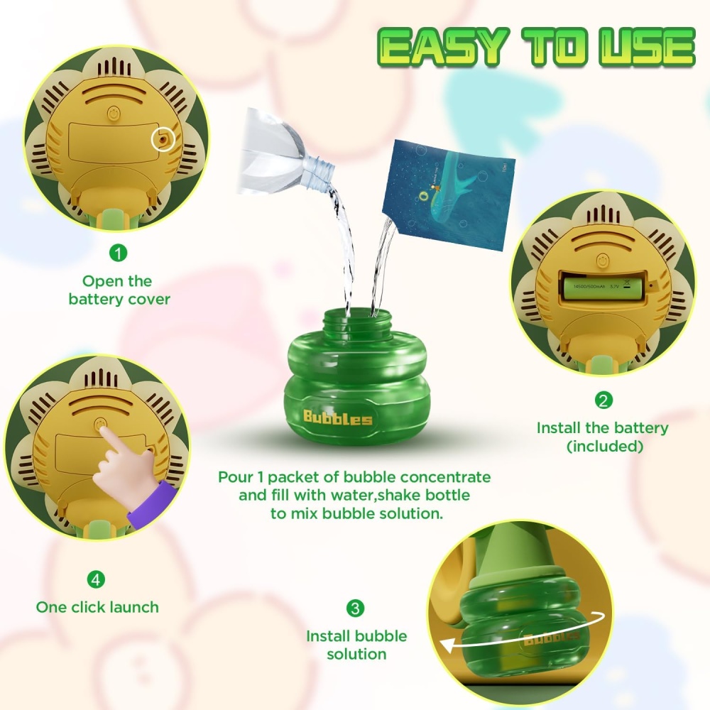 Just insert the battery, screw on the bubble solution tank, attach the handle, and press the power switch.