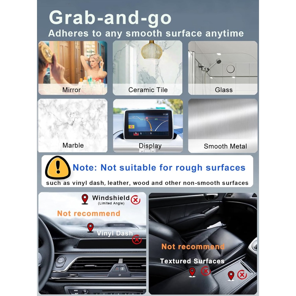 This phone mount combines both vacuum suction and magnetic power, allowing it to attach to various smooth surfaces like mirrors, glass, marble, tiles, gym equipment, refrigerators, and more. It's ideal for driving, workouts, showering, cooking, makeup, or content creation on social media platforms like TikTok, YouTube, and Instagram.