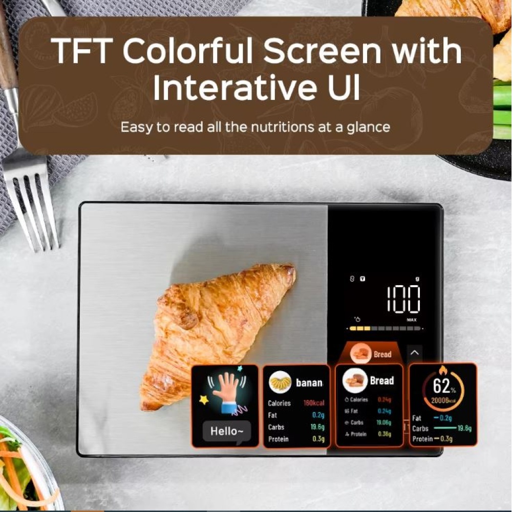 Displays calories, fats, carbs, proteins, and other nutrients directly on the LED screen, while automatically syncing data to the Fitdays+ app for accurate food tracking.