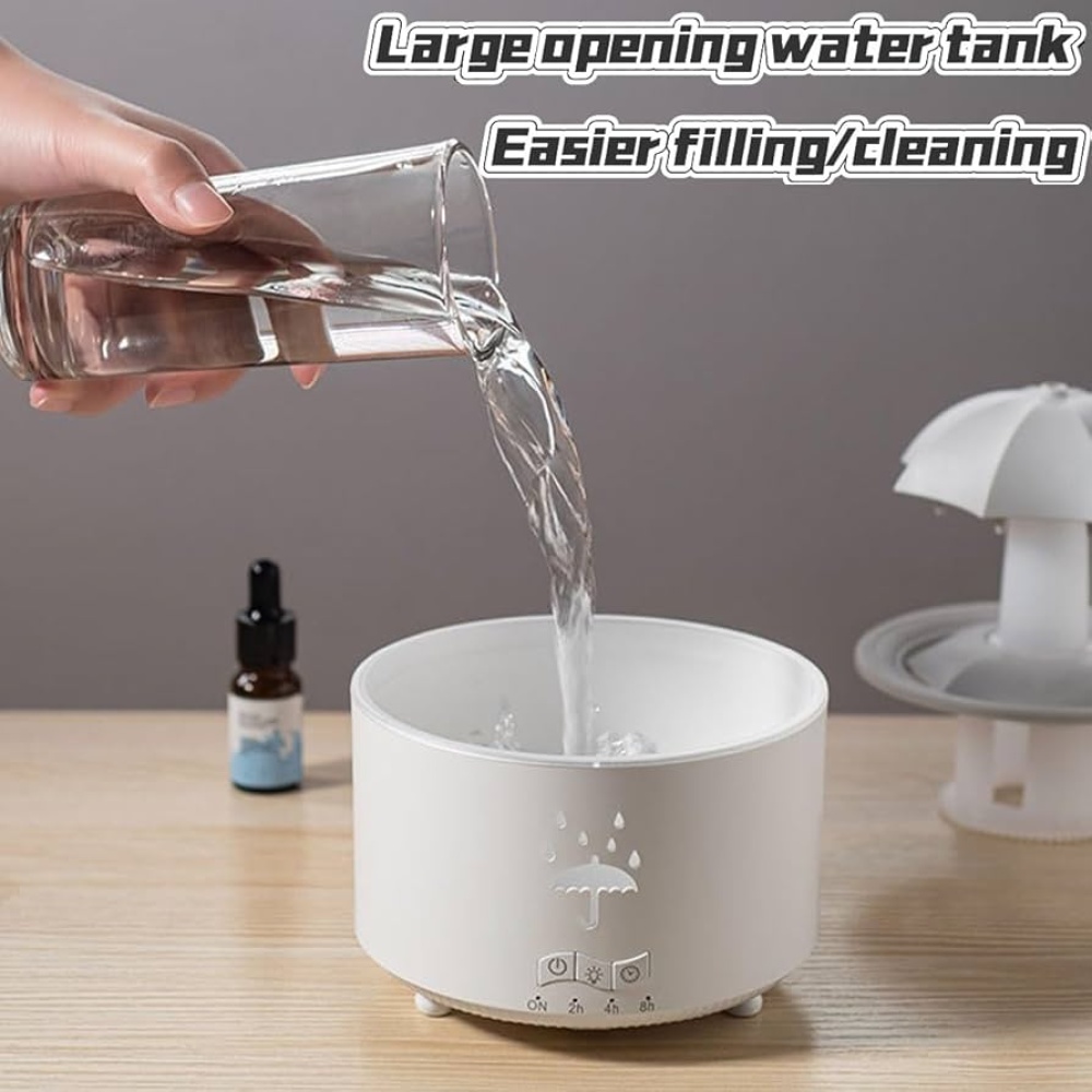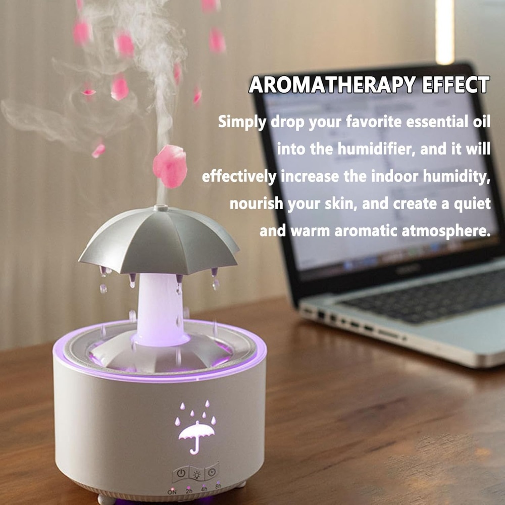 • Water Drop Simulation & Rain Sound Machine This rain humidifier mimics soothing rain sounds and realistic water drops, creating a calming atmosphere in your bedroom or office. Ideal for work from home essentials or a peaceful rain machine for sleeping.