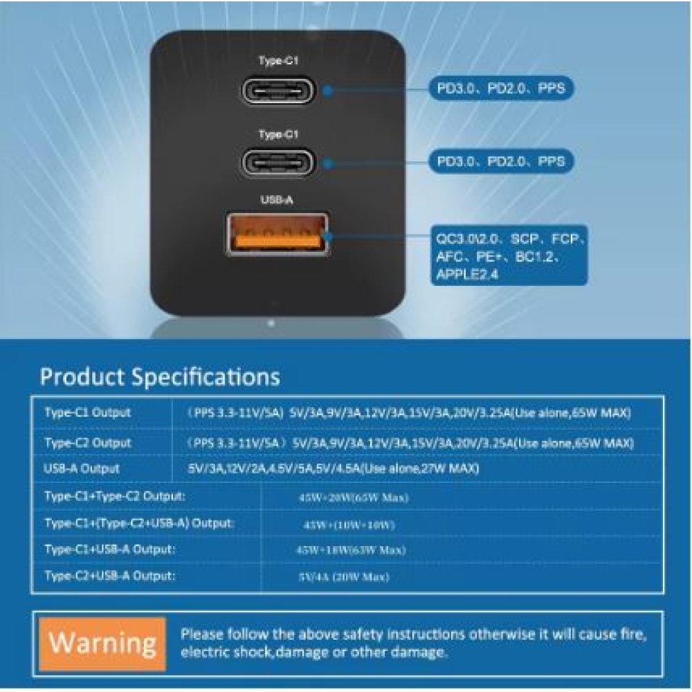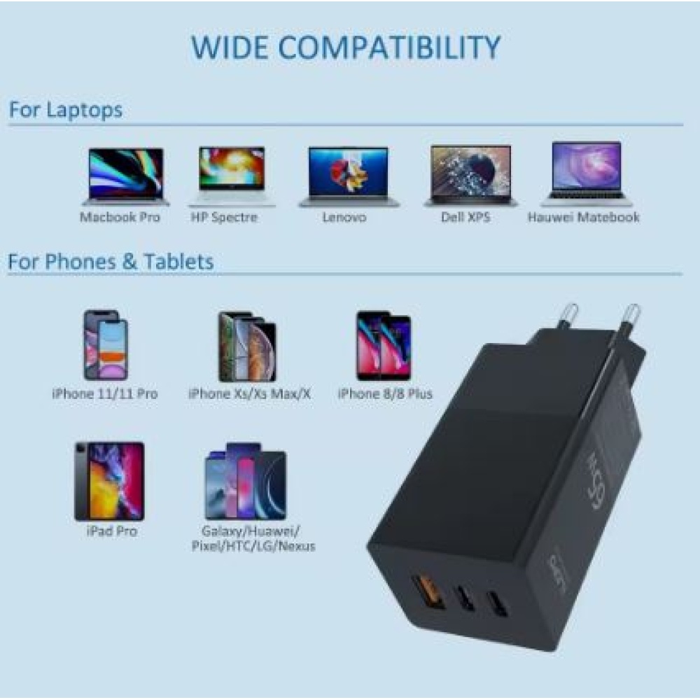 High-Power Output: 65W GaN (Gallium Nitride) charger ensures ultra-fast charging for laptops, tablets, and smartphones.