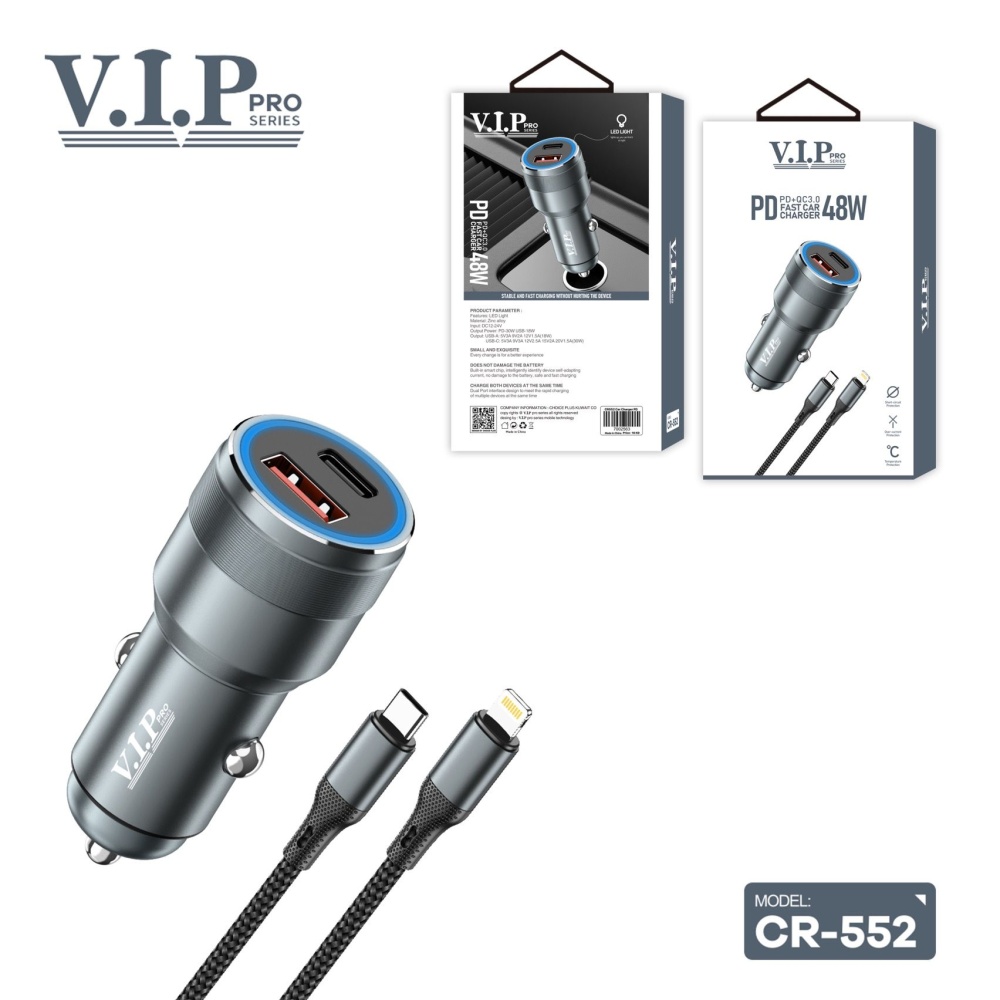 VIP Pro Series Fast Car Charger with USB-C to Lightning Cable PD 48W (CR-552)