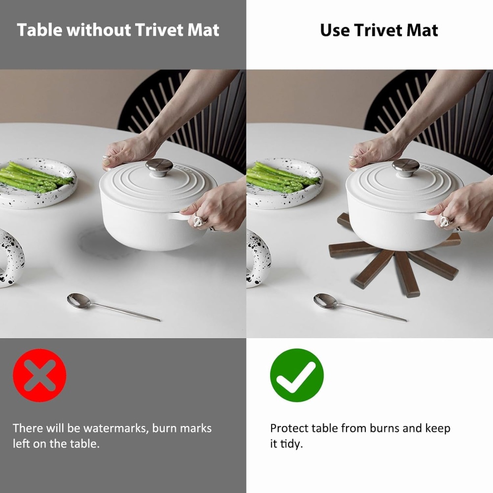 Made from premium black wood, our trivet set is cut and polished to perfection with a smooth and delicate surface. Each insulation pad is hand-strung with elastic materials, ensuring flexibility and durability. It expands and shrinks depending on the pressure applied, making it versatile and efficient for various uses.